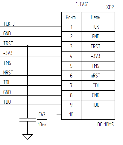 Для обеспечения кратковременного низкого уровня на нем при подаче питания на устройство проверенным решением является подключение его к «земле» через конденсатор емкостью 10 мкФ. Остальные выводы JTAG не требуют дополнительной обвязки на устройстве и могут быть выведены на разъем напрямую, см. рисунок ниже: